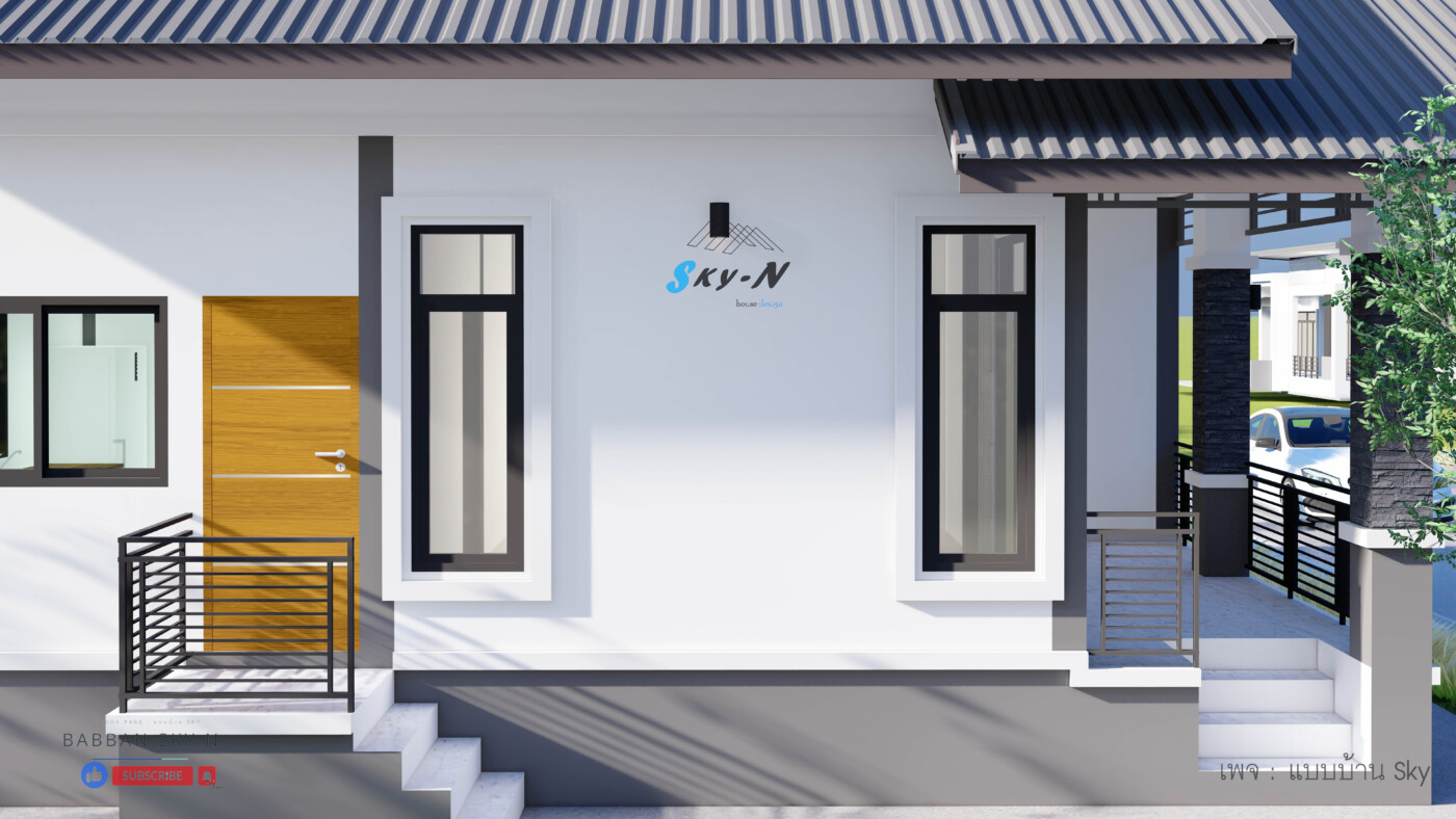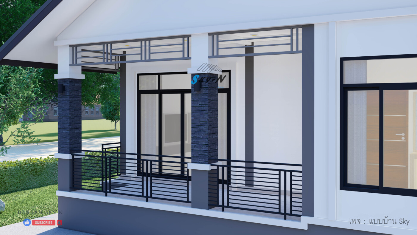 – ราวกันตกเหล็กสีดำแบบแนวนอน สร้างความรู้สึกโมเดิร์นและปลอดภัย โดยมีจังหวะเส้นที่ต่อเนื่องรอบระเบียง