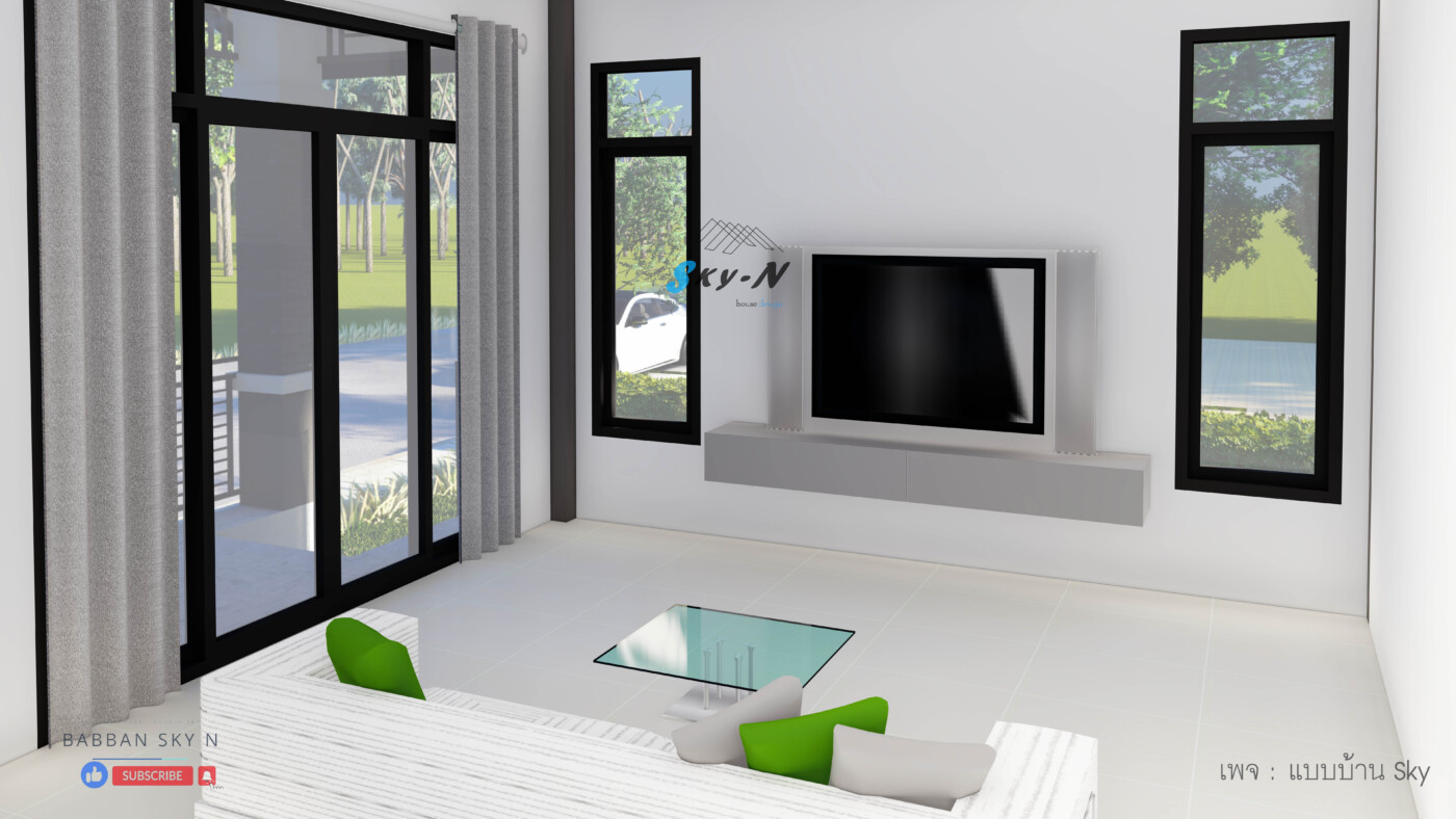 – หน้าต่างและประตูขนาดใหญ่ ใช้กรอบสีดำตัดกับผนังสีอ่อน ช่วยให้บ้านดูทันสมัยและรับแสงธรรมชาติได้ดี