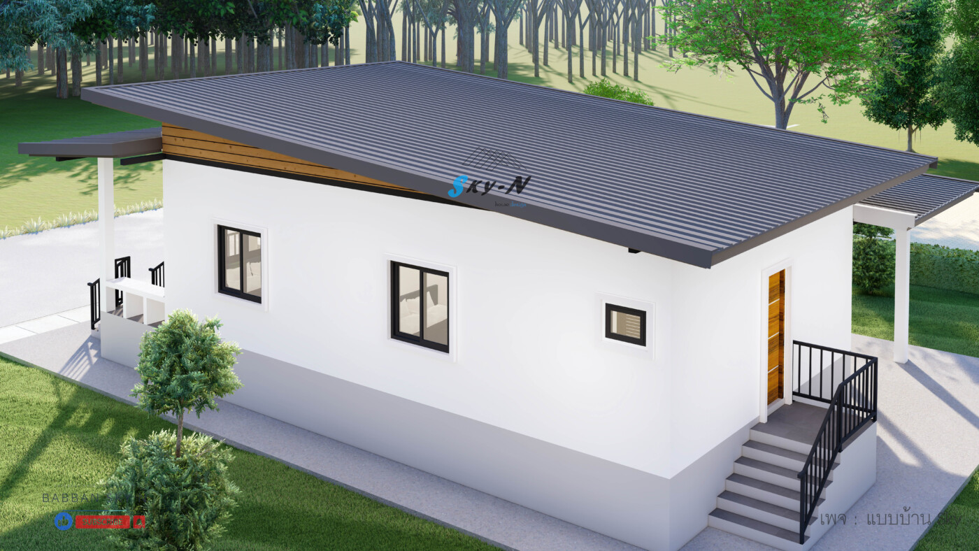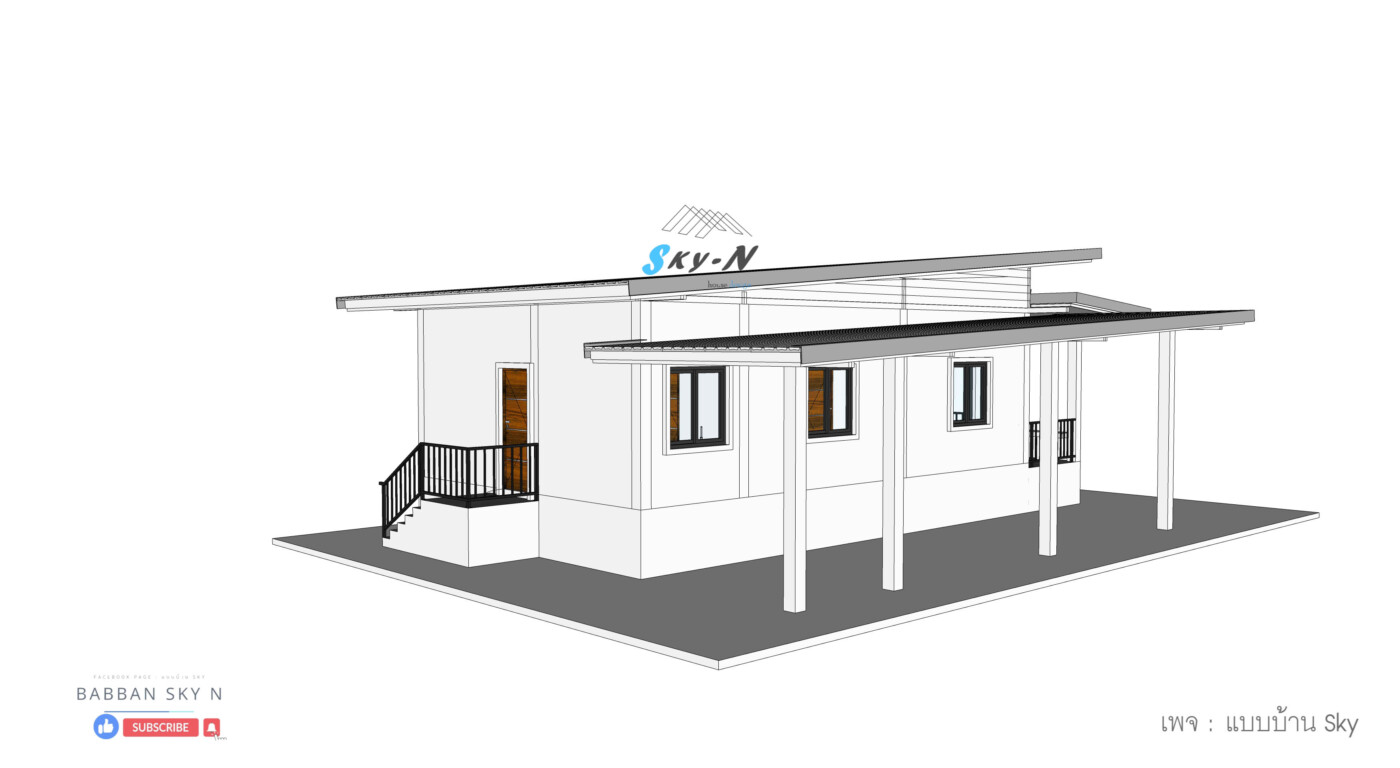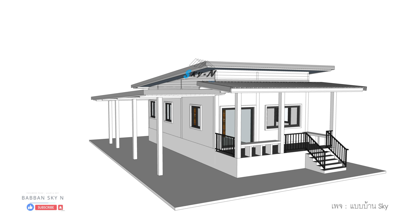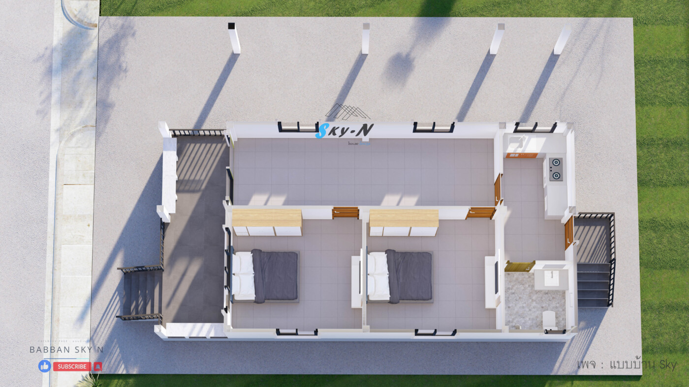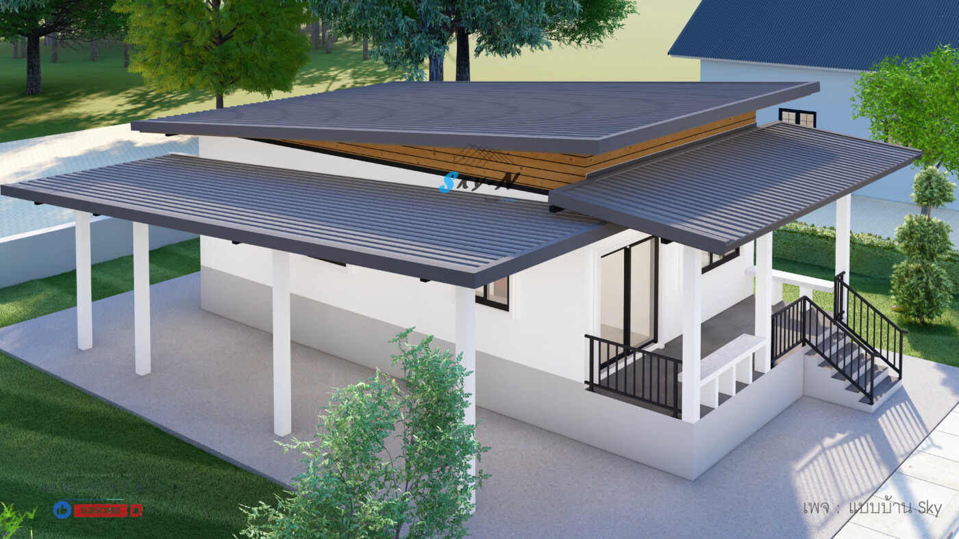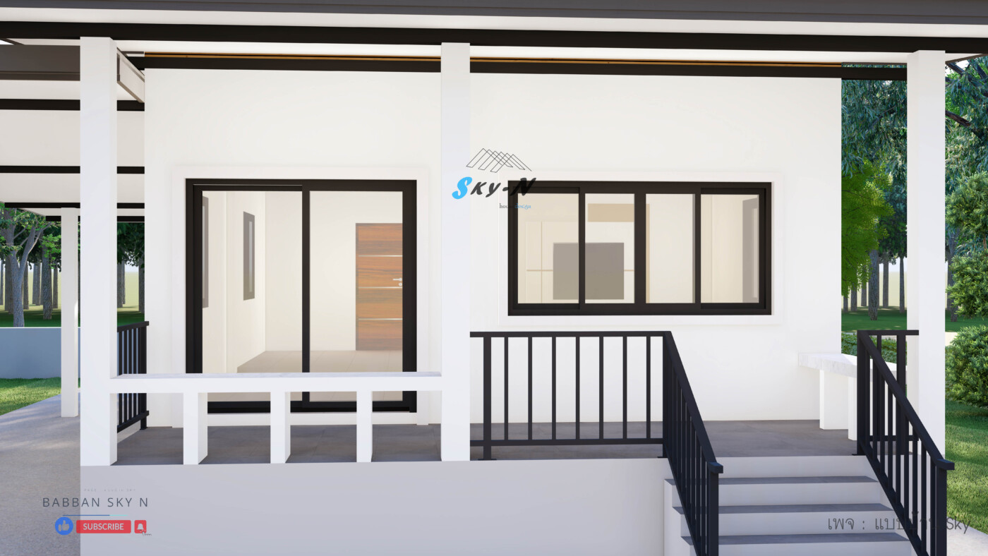 – ใช้เสาเรียบสีขาว ค้ำยันชายคายื่นออกมาทางด้านซ้าย (เป็นพื้นที่จอดรถ) และพื้นที่ระเบียงด้านหน้า
