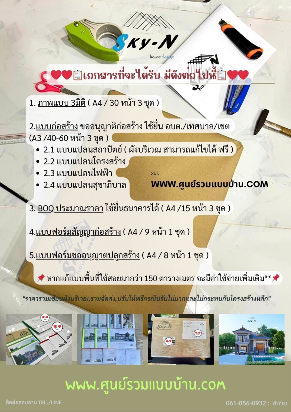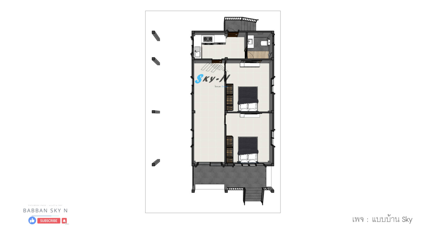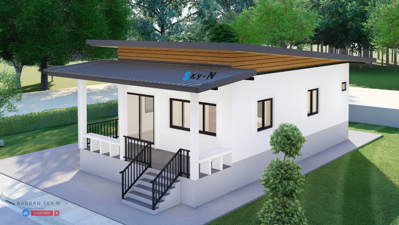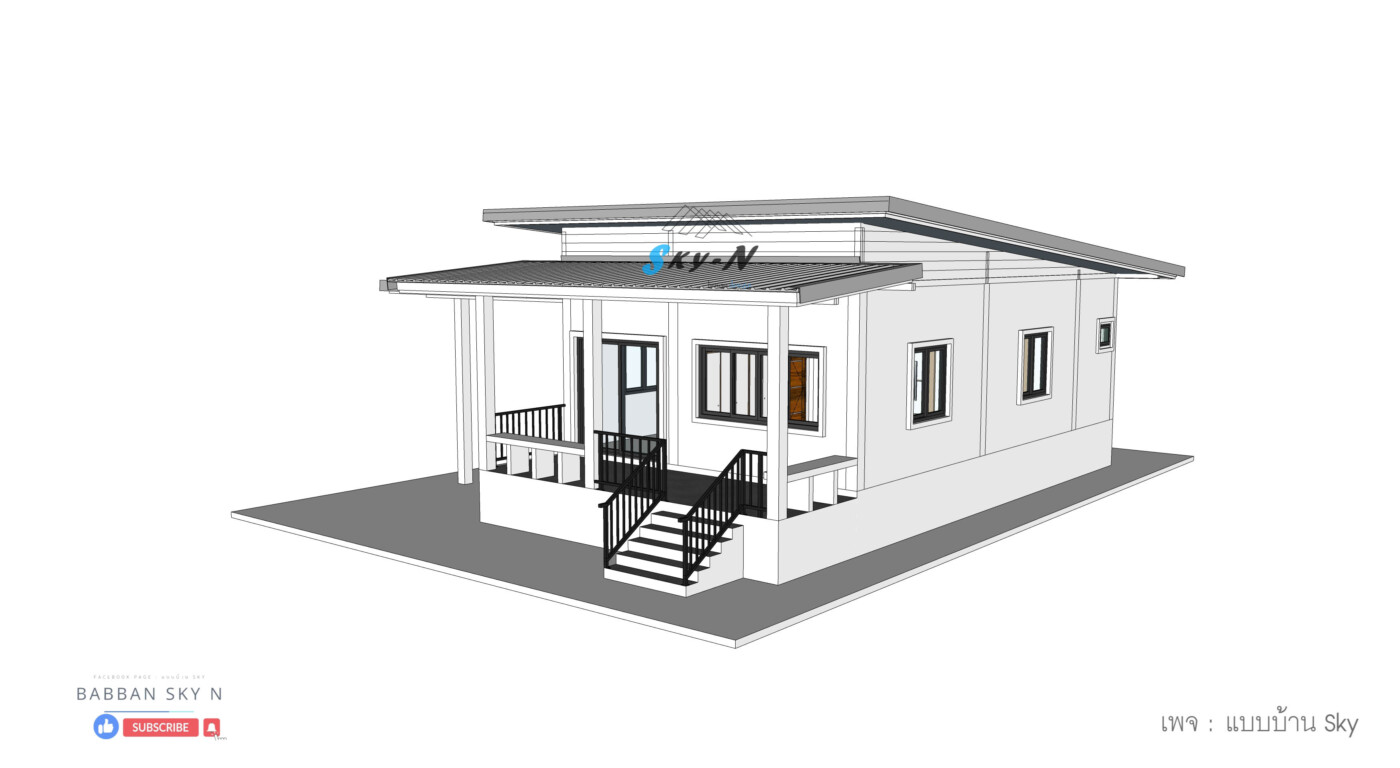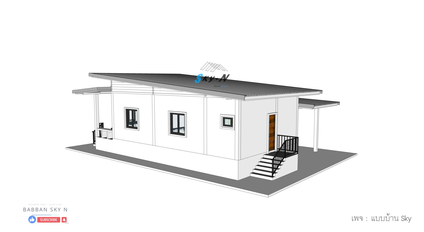 – ใช้เสาเรียบสีขาว ค้ำยันชายคายื่นออกมาทางด้านซ้าย (เป็นพื้นที่จอดรถ) และพื้นที่ระเบียงด้านหน้า